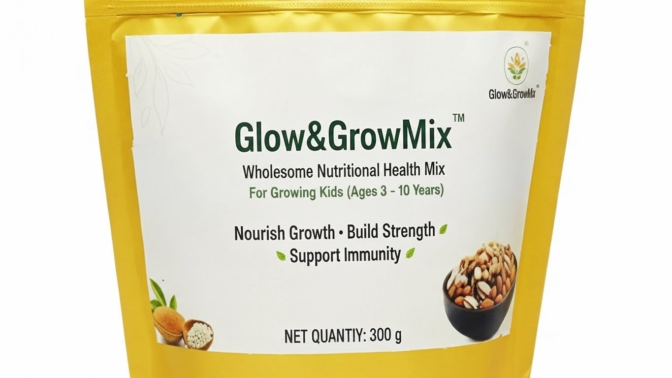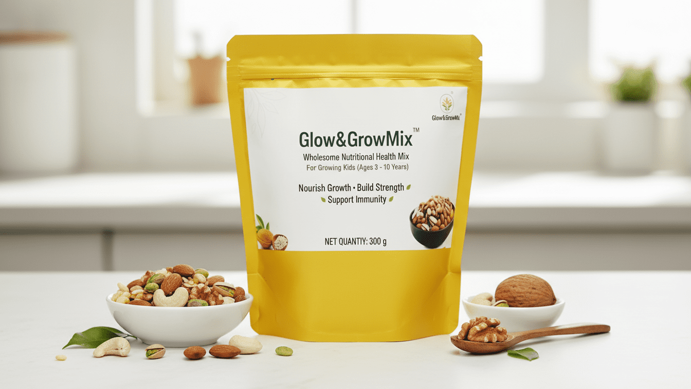Glow&GrowMix – Kids is a nutritious health mix specially formulated for children below 10 years. It is made from carefully selected grains, nuts, seeds, natural sweeteners, and mild spices that support healthy growth, strong bones, energy, digestion, and overall development when consumed as part of a balanced diet.