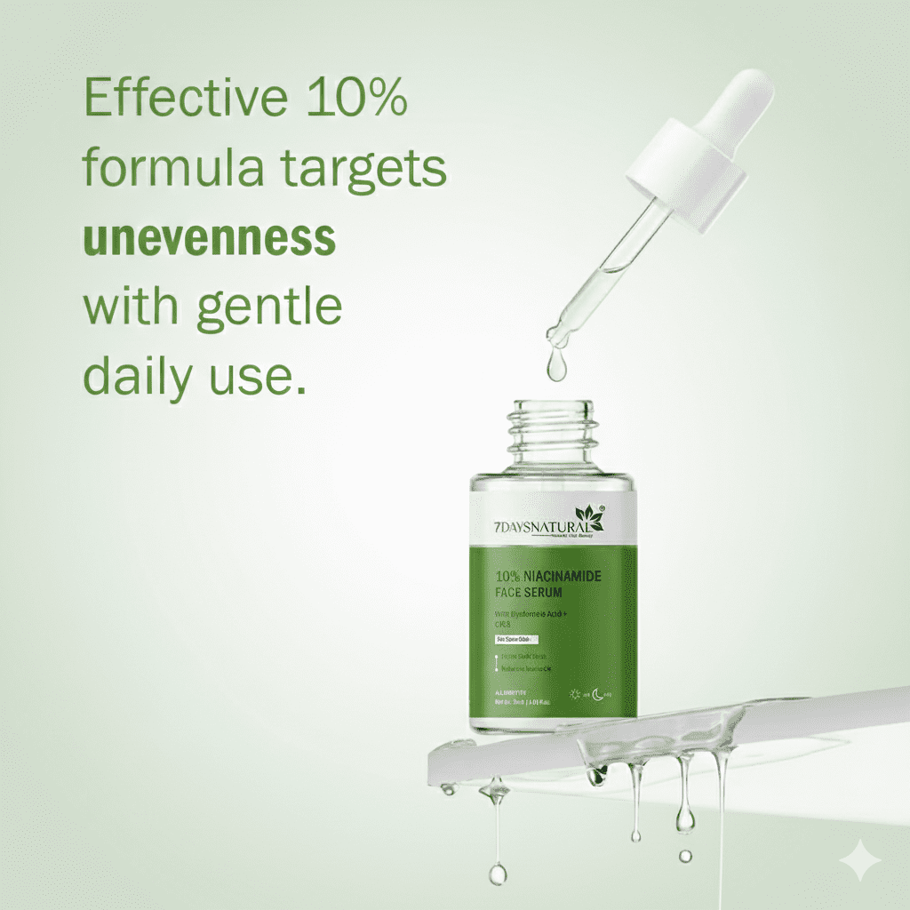 7DAYSNATURAL 10% Niacinamide Face Serum is an advanced daily treatment designed to target uneven skin tone, visible dark spots, and rough texture. The effective yet gentle 10% formula helps improve overall skin clarity while maintaining comfort for daily use.
