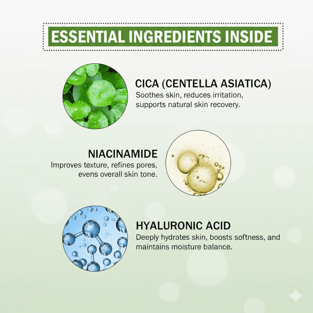 Infused with Niacinamide, Hyaluronic Acid, and CICA (Centella Asiatica), the serum supports hydration, pore refinement, and skin recovery. Its lightweight texture absorbs quickly, leaving skin balanced, soft, and refreshed without greasiness.